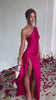 Designed with a sleek one-shoulder neckline and a flattering high slit, this dress enhances your shape while keeping an elegant, timeless look. The draped detailing adds a luxurious finish.